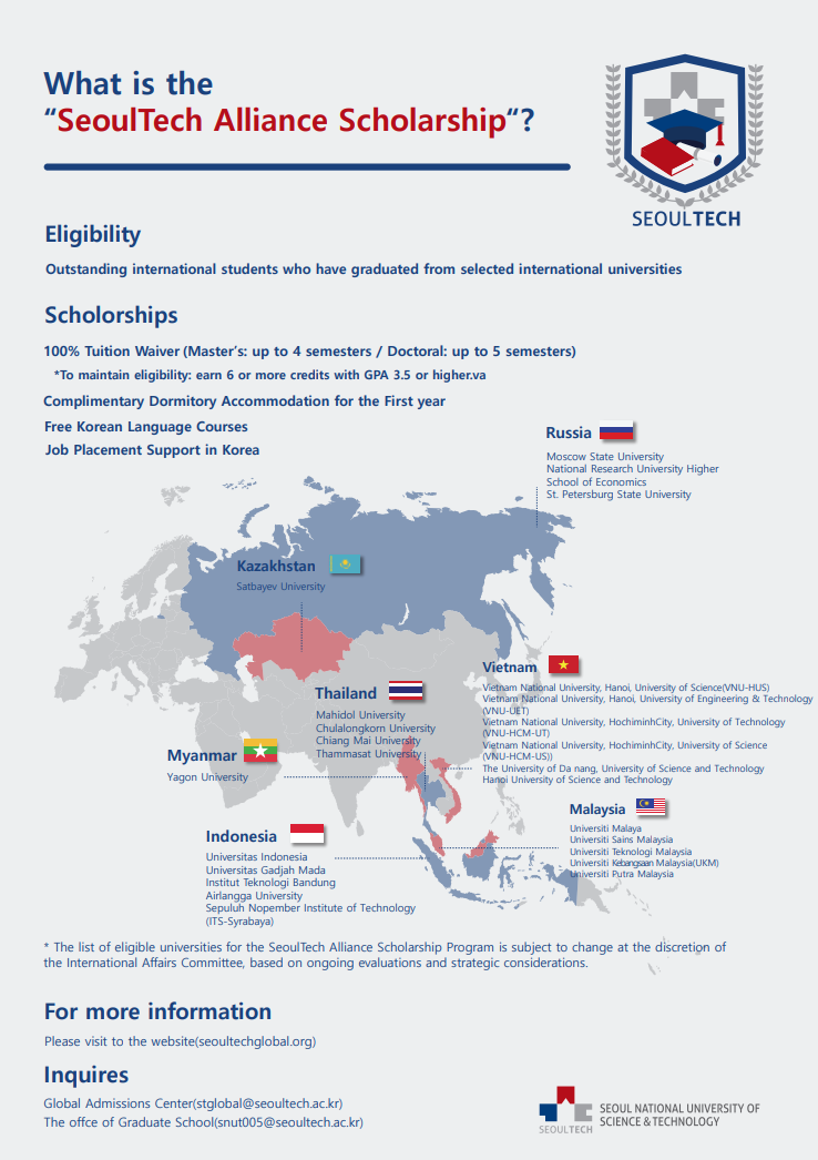 Senarai universiti yang layak untuk Program Biasiswa Perikatan SeoulTech boleh berubah mengikut budi bicara Jawatankuasa Hal Ehwal Antarabangsa, berdasarkan penilaian berterusan dan pertimbangan strategik.