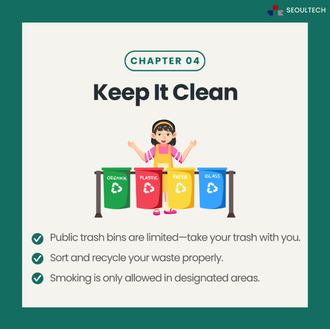 Koreans take cleanliness seriously. Trash bins can be rare, but don’t litter! Separate recyclables (plastic, paper, food waste), especially at home or in shared spaces.