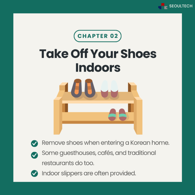 Don’t bring your outside mess inside. Always take off your shoes when entering a home (and some cafés or guesthouses). Slippers provided = wear them!