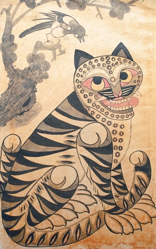 Tigers in Folk Art (Joseon Dynasty): A folk painting from the Joseon Dynasty is called 'Kkachi Horangi' (Magpie and Tiger Painting). The tiger, which should be scary, has a somewhat funny and comical expression. These tigers served as guardian spirits that warded off bad luck and brought good news.